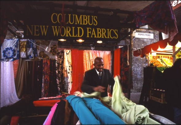 When this picture was taken, Oswald ‘Columbus’ Denniston was a sprightly 76, and had been selling fabrics in Brixton for nearly thirty years – the first Afro-Caribbean trader in Brixton market. The photo was commissioned for a Sunday Times Magazine article on London street traders (which never appeared as the ‘London’ section of the magazine folded before the feature was published). By this time in his life, Oswald Denniston had become a potent symbol for the black community in London, his manifest virtues of charm, capability and decency commanding widespread fondness and admiration. The quote from Mayhew seems appropriate here, for surely no-one has ever travelled so far to sell fabrics as Columbus Denniston.