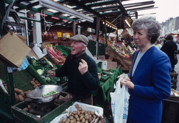 Posted: March 30, 2012 Filed under: Food, London Types, Markets, Street Portraits | Tags: Bobby Redrupp, Chapel Market, fruit and veg, Islington, London markets, Susan Grindley Comments Off on Street traders. Photo David Secombe, text Susan Grindley. (3/3)Bobby Redrupp and customer, Chapel Market, 1990. © David Secombe.