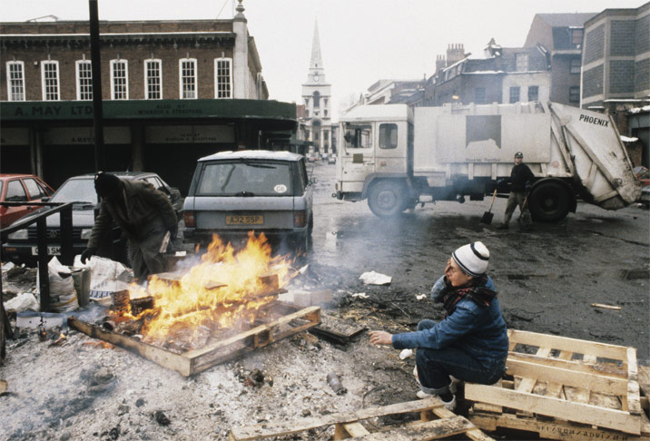 The photo above was taken twenty-one years ago, and shows homeless people lingering around a bonfire of pallets near the old Spitalfields vegetable market. Hawksmoor’s majestic Christ Church is seen in the distance. Spitalfields used to be cited by ‘psychogeographers’ as one of those London locales where the sad history of the city was engraved upon its streets and buildings: a place that was permanently wrong. The district’s association with poverty, with Jack the Ripper, the waves of the dispossessed that have settled over the centuries – this stuff was meat and drink to the likes of Iain Sinclair and Peter Ackroyd. For his part, Jack London’s attempt to discover the Edwardian East End bore fruit in a book which documented in depressing detail the squalor of Spitalfields, and included photos of down and outs sleeping against the walls of Christ Church. In the 1960s there were moves to demolish the entire area – including Hawksmoor’s church – and the time-locked deprivation of the Georgian district was eloquently pictured by the makers of the film based on Geoffrey Fletcher’s London gazetteer The London Nobody Knows, and by photographers Don McCullin, Paul Trevor and (later) Marketa Luscacova.