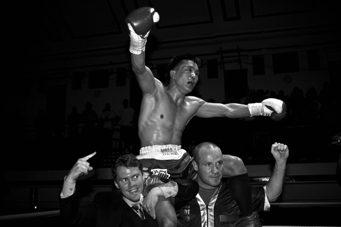 Most interesting to me are the slower moments of pathos where the fighters slump into each others’ arms, sometimes in no hurry to extricate themselves as they agree to take a breather, or where a fighter sits sullenly in a corner, advice bouncing off him as he readies himself to go back for another painful round of inevitable beating. It’s in these moments rather than the sporty moments of competitors hitting each other that boxing gains its power and epic proportions.