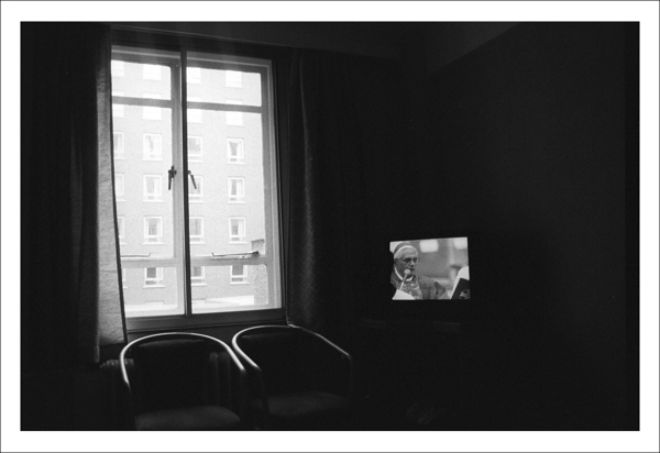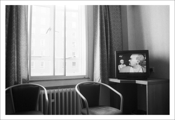 Photography is full of sad hotel rooms; Tim’s pictures remind me of canonical images by Robert Frank, Lee Friedlander, William Egglestone and others. They also bring to mind scenes from 1940s film noir, not to mention the aforesaid Barton Fink and, of course, The Shining. But all those references are American; most of the sad hotels referenced in British culture are of the sad, faded or seedy boarding house type, the ones found in Graham Greene or Patrick Hamilton novels, Larkin’s poems, Rattigan and Pinter plays, etc. (Over thirty years ago I found myself spending a winter’s night as the only guest in a B&B in Scarborough, a huge Victorian house where the landlady was a gentle widow. I remember her showing me the accommodation and commenting that she had many backpackers staying in summer, and that she regretted not travelling when she was younger; as she spoke, snow began to fall past the bedroom window. That encounter struck me as the quintessential British bed and breakfast experience.)