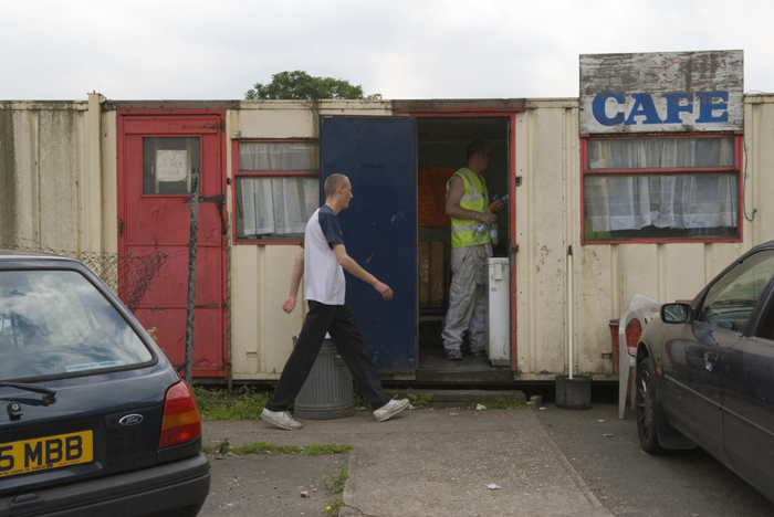 Posted: July 12, 2012 Filed under: Transport, Vanishings | Tags: greasy spoon, Homer Sykes, Joe Public, Olympic Park, Tim Wells Comments Off on Before the Blue Wall. Photo: Homer Sykes, text: Tim Wells (3/4)Transport cafe, Hackney Marshes. © Homer Sykes 2006.